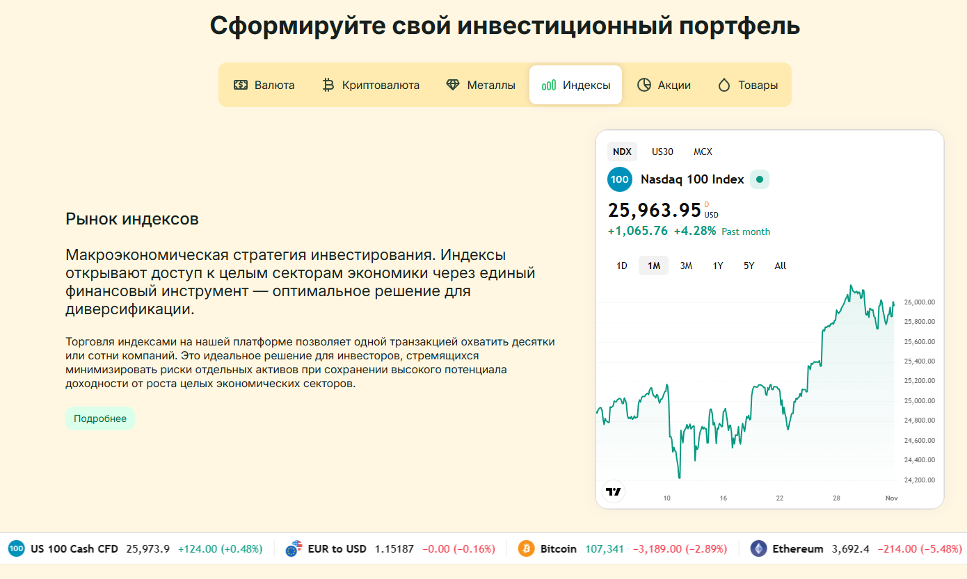 Брокер предлагает торговлю CFD-контрактами на различные активы: