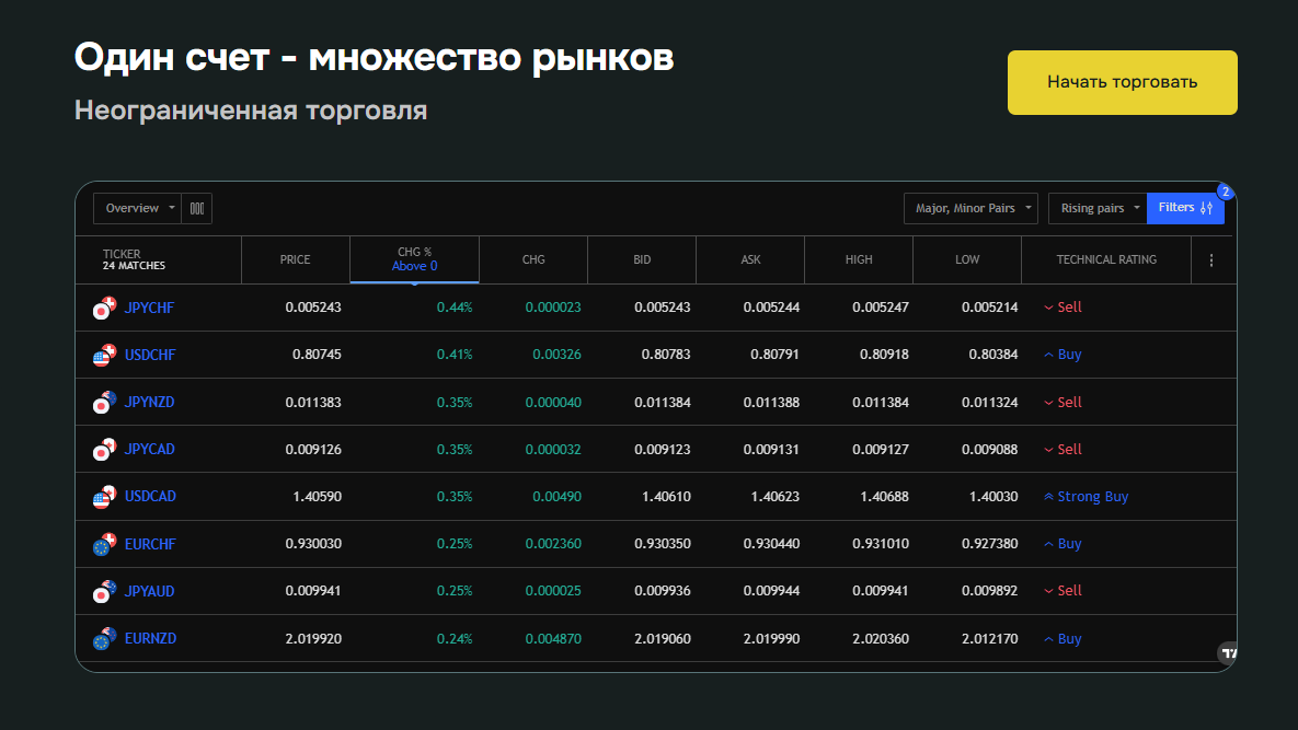 - Доступ к валютным парам, индексам, акциям и криптовалютам