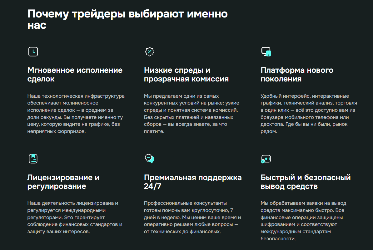 При этом техническая часть полностью не раскрыта: не указано, какая торговая платформа используется, кто является поставщиком ликвидности, как реализуется исполнение ордеров, отсутствуют ссылки на клиентское соглашение и регламент операций.