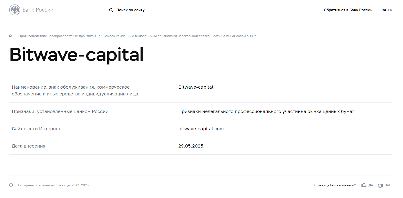 - Такая деятельность относит Bitwave Capital к группе нелицензированных брокеров, которые часто попадают под официальные предупреждения и санкции, хотя конкретных регуляторов здесь пока может и не быть, но индикатор слабого доверия очевиден.