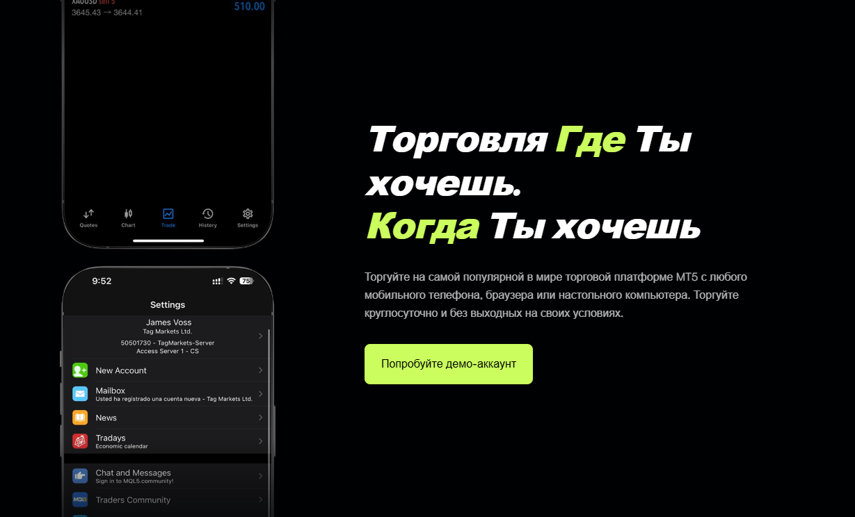 Tag Markets заявляет о доступе к MetaTrader и собственной платформе. Компания обещает быстрое исполнение ордеров и отсутствие задержек. При этом не раскрывается тип исполнения сделок, поставщики ликвидности и реальные торговые издержки.