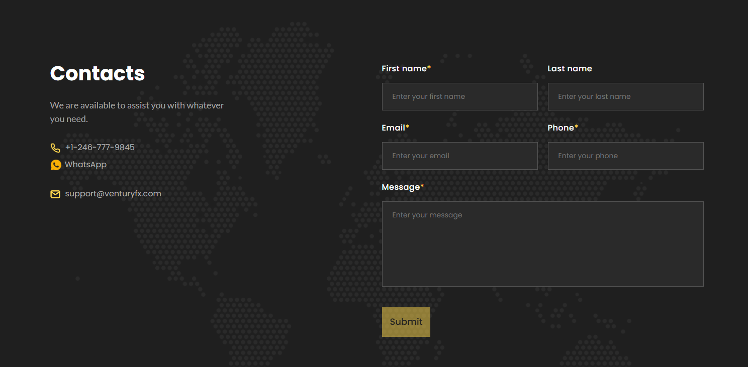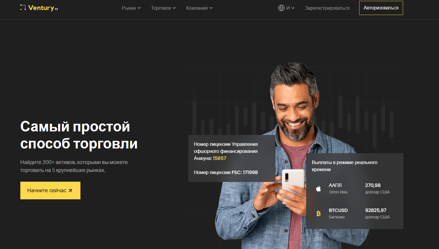 VenturyFX позиционирует себя как международного брокера, предоставляющего доступ к широкому спектру финансовых инструментов. На сайте заявляется опыт работы с 2018 года, наличие регулирования и ориентированность на частных инвесторов. Однако при детальном анализе выясняется, что реальная структура проекта не соответствует стандартам легальной брокерской деятельности.